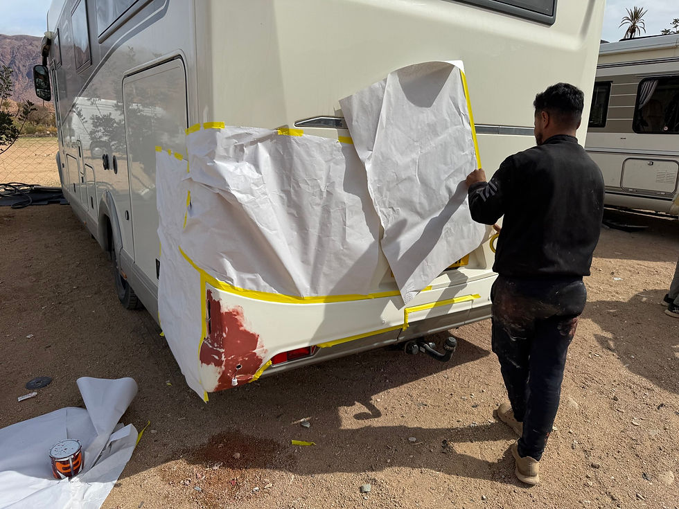 Mo Mo and Said have a garage here which caters for motorhome repairs - in particular re-sprays. Lionel could do with some attention to a war inflicted on a previous trip, Mo Mo says he can do it the next day for the equivalent of £120.00 - a fraction of the price we'd pay at home - we book him in.