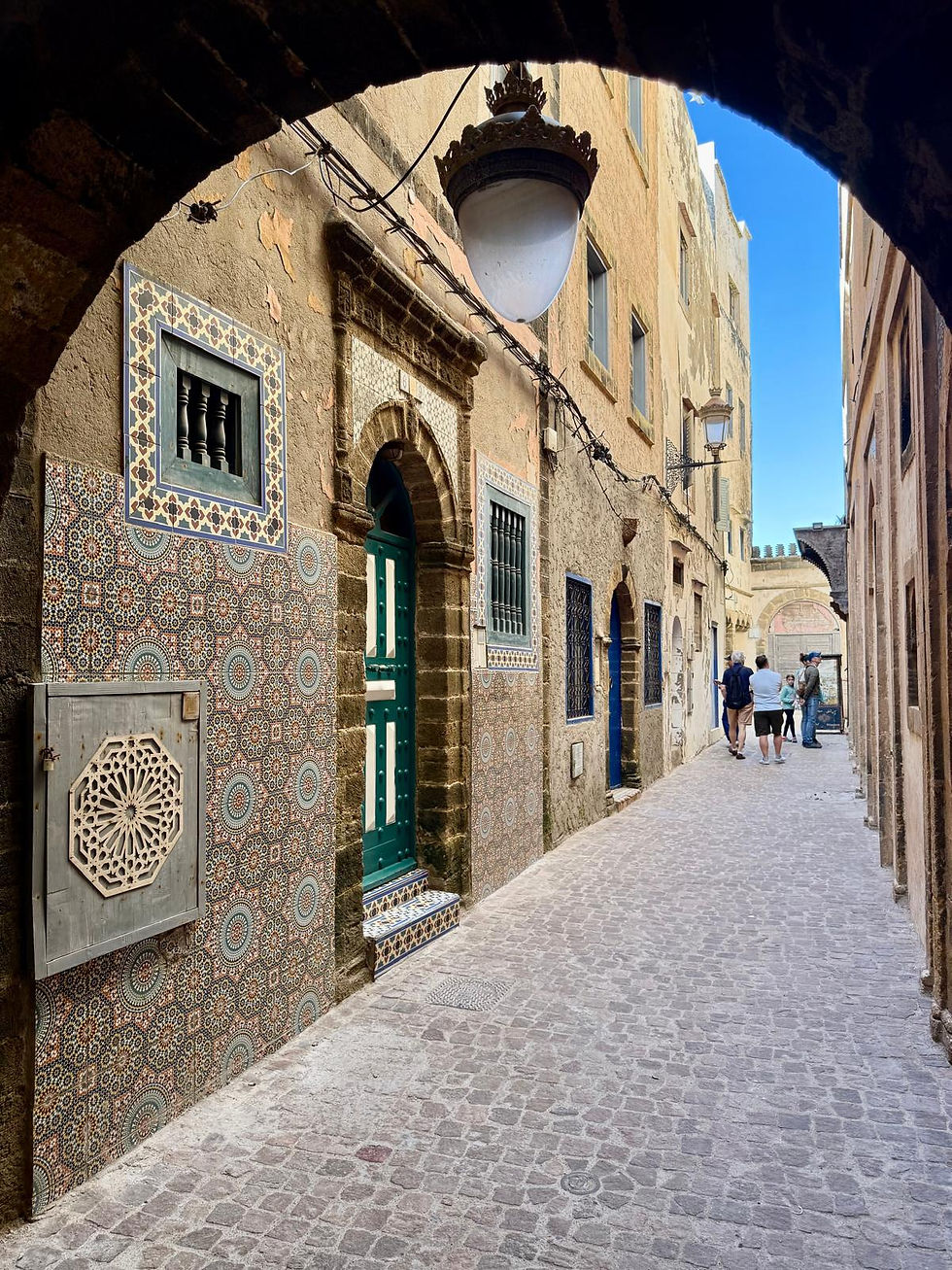 As we wander the back streets of the medina we admire the ornate tiles and then we're stopped in our tracks. Above a rather scruffy doorway are exactly the same tiles, same design, same colour as were on the wall in Janettes childhood home, she is delighted!