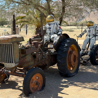 Once we’ve descended the pass, the countryside is flat grassland for many miles. We stop in a very quirky cafe - the only sign of life we pass. The crashed space rocket and the astronauts aside, we discover the beer is served from a converted petrol pump!