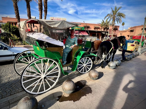 We’ve done quite a bit of walking and so we take a horse drawn carriage to the Jemaa el Fnaa.